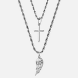 The Gold Cross & Wing Pendant Set unites faith with freedom. A symbol of guidance and protection, it adds a divine touch to your wardrobe, radiating grace and strength.
