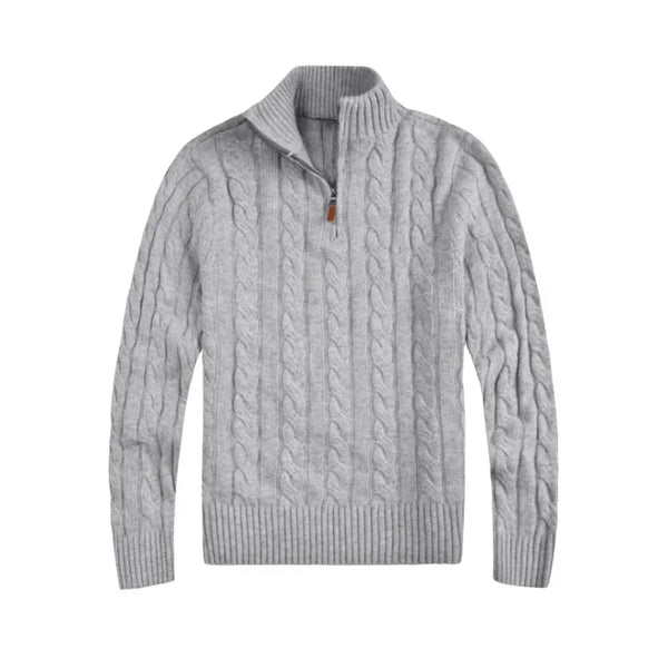 Long sleeve sweater made of spun cotton fabric. High neck with front zip fastening collar and ribbed trims.