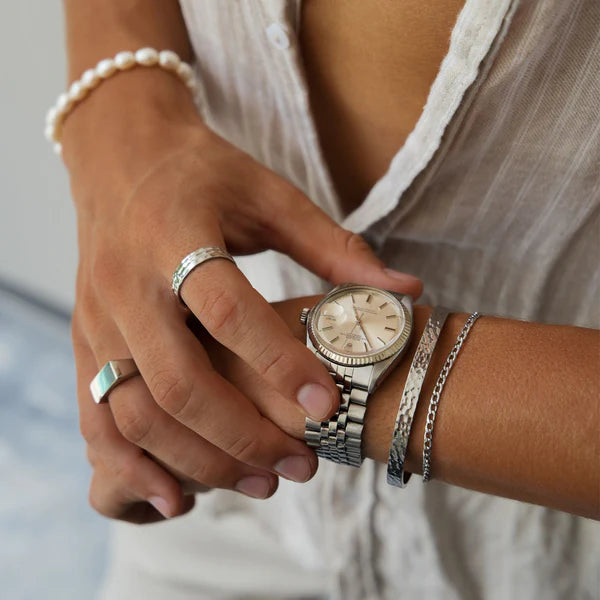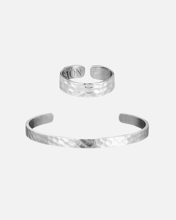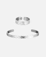 Unleash your edgy side with OZI hammered cuff silver bracelet and ZAWZI hammered silver ring.