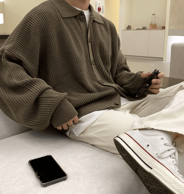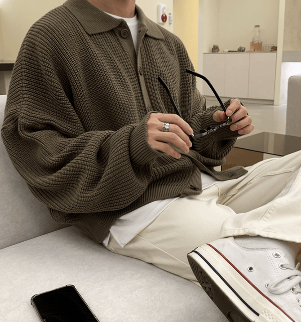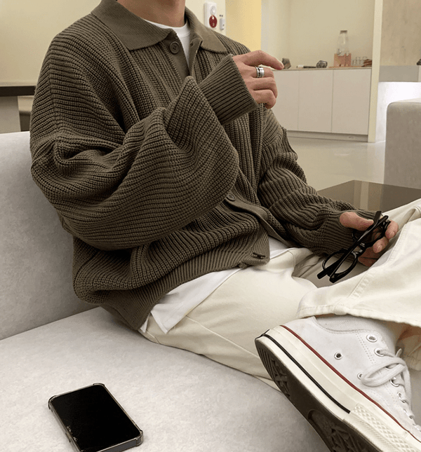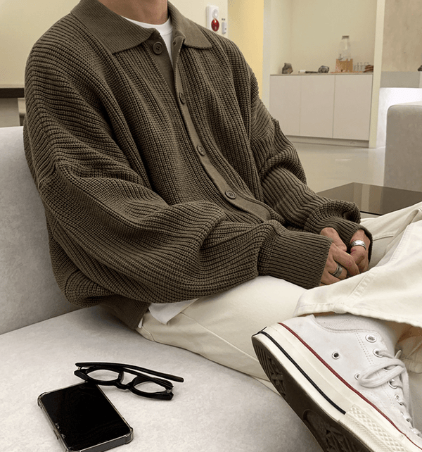 "DARK BROWN" FULL BUTTON-UP COLLAR SWEATER