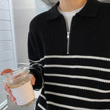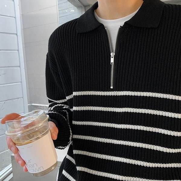 Revitalize your wardrobe with our "KNITTED" Black Striped Half-Zip Sweater.