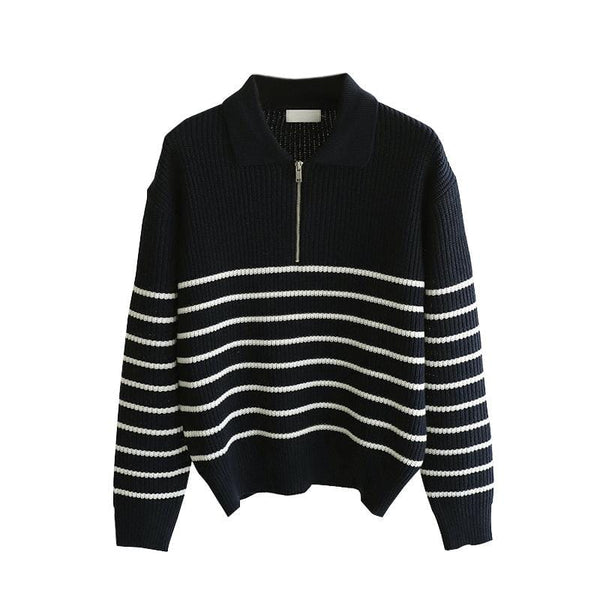 A stylish piece that combines classic knitwear with a modern twist. The black stripes add a touch of sophistication, while the half-zip design provides versatility and ease of wear. Perfect for making a statement while staying cozy, this sweater is a must-have for the fashion-forward individual.