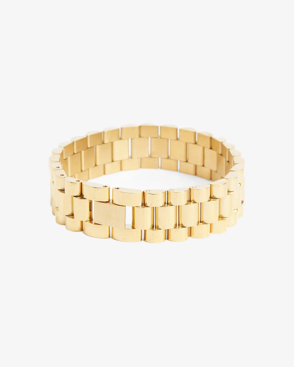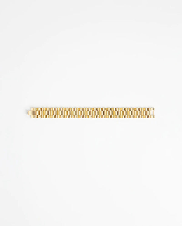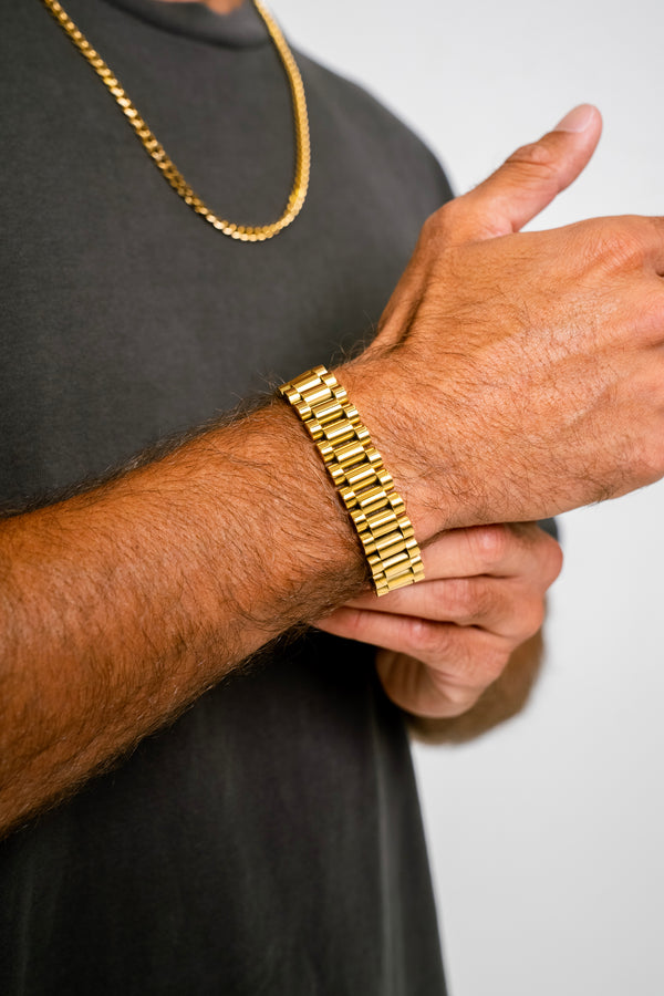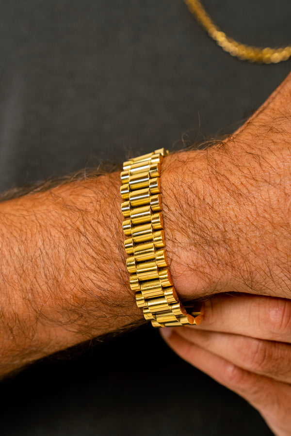 The 15MM "PRÉSIDENT" Link Bracelet - Gold is a timeless and elegant addition to any jewelry collection. Crafted from real gold, its sleek and supple design is perfect for layering or wearing on its own.