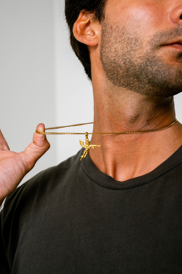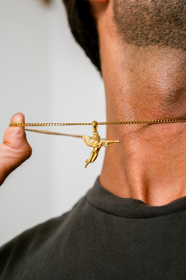 Let Cupid's arrow strike back with the "Cupid's Revenge" Gold pendant, symbolizing the power of love as a weapon of choice. Wear it to make a statement and take control of your own love story.